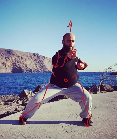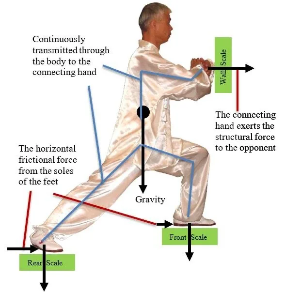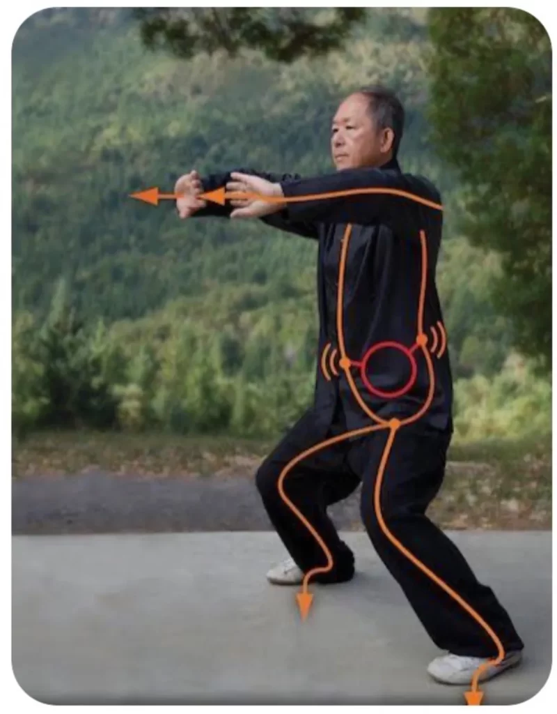 Tai Chi Master Jie Gung demonstrating the mechanical principles of Tai Chi. This diagram demonstrates the principle of ‘sequential force in which the body is coordinated from the centre using relaxation, tension, flexion and rotation to generate power up through the legs and into the hands.