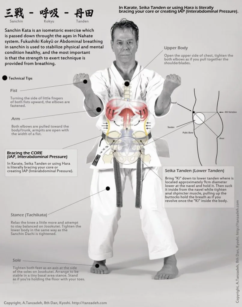 Canadian Shito Ryu Karate Master Allen Tanzadeh demomstrates the principles of the integration of abdominal breathing (Fukushiki Kokyu) and core bracing (Seika Tanden) to stabilize the body and generate power in the practice of Sanchin Kata.