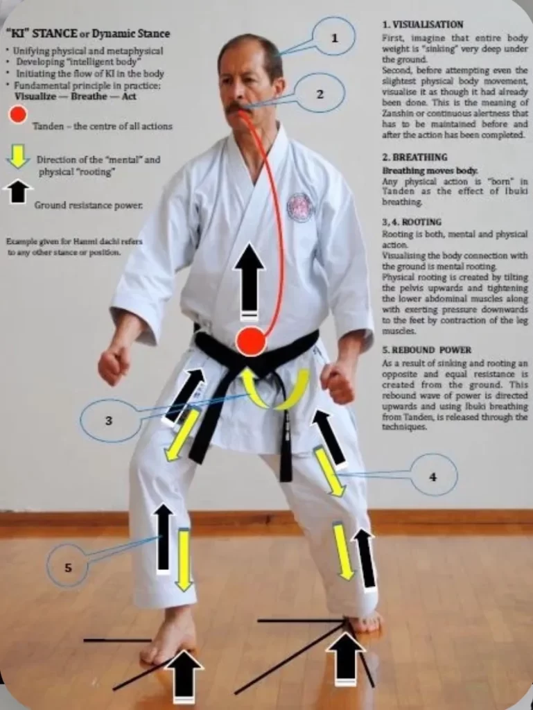 Yugaslavian Kase Ha Shotokan Sensei Velibor Dimitrijevic demomstrates the ‘Ki Stance’ which utilises weight sinking, spinal flexion, breathing and reactionary force using tension through the legs with the ground to a rapid expansion of power.